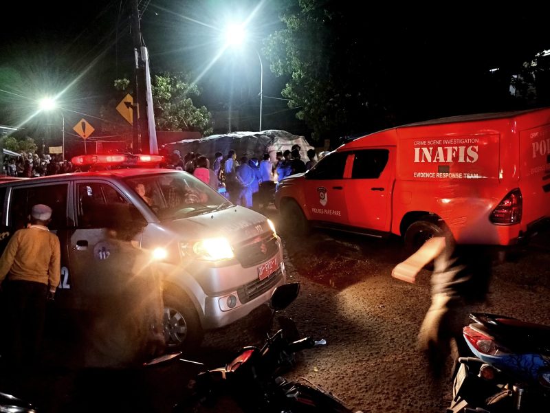 Petugas Polsek Soreang dibantu tim call center 112 dan Badan penanggulangan bencana daerah Parepare mengevakuasi mayat ke Rumah Sakit andi Makkasau untuk diotopsi.