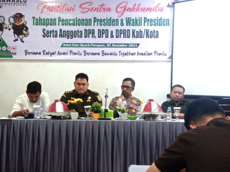 PAREPARE (Rilis.News)– Satukan persepsi dan konsistensi mengawal dan mengamankan pemilu 2024, Kapolres Parepare mengutus Waka Polres Parepare Kompol Muttalib menghadiri kegiatan Fasilitasi Sentra Gakkumdu Tahapan Pencalonan Presiden dan Wakil Presiden Serta Anggota DPR, DPD dan DPRD Kab / Kita yang di selenggarakan oleh Bawaslu Kota Parepare di salah satu hotel yang terletak di di Jl. Mattirotasi, Kota Parepare. Selasa (5/12/2023) pagi.