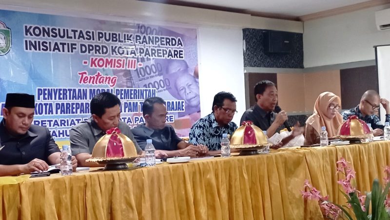 PAREPARE (Rilisnews) – Komisi III DPRD Kota Parepare menggelar menggelar Forum Konsultasi Publik Rancangan Peraturan Daerah (Ranperda) Inisiatif DPRD Parepare tentang Penyertaan Modal Pemerintah Kota Parepare kepada PAM Tirta Karajae, di Hotel Grand Kartika, Jl. H. Agussalim, Kelurahan Mallusetasi, Kecamatan Ujung, Kota Parepare, Selasa (18/7/2023).