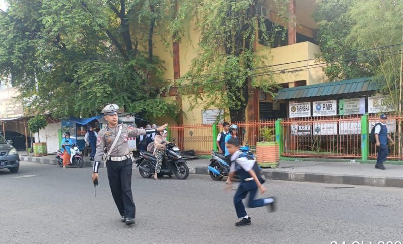 Tidak hanya fokus pada pengaturan arus lalu lintas, personel Sat Lantas juga memberikan perlindungan dan pelayanan kepada para pejalan kaki yang sedang melakukan aktivitas, seperti pengantaran anak sekolah.