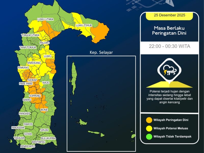 MAKASSAR – Badan Meteorologi, Klimatologi, dan Geofisika (BMKG) Makassar memprakirakan mayoritas wilayah Sulawesi Selatan akan mengalami hujan dengan intensitas ringan hingga sedang pada Jumat, 26 Desember 2025.