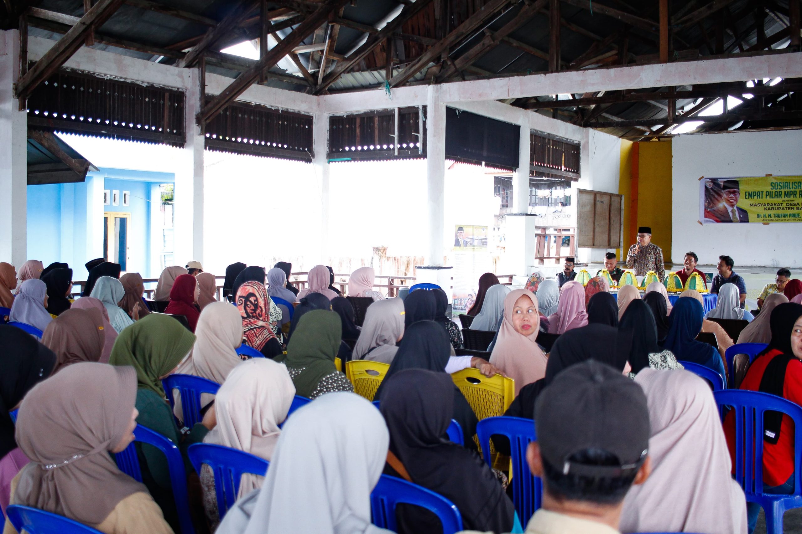 BARRU – Anggota DPR RI Fraksi Partai Golkar Taufan Pawe, mensosialisasikan Empat Pilar Kebangsaan (sospilar) di Balai Desa Pancana, Kabupaten Barru, Senin (15/12/2025).